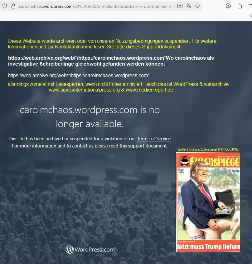 www.corporate-media-masteraward.com www.lifepr.de/inaktiv/medienreport-verlags-gmbh-medienberatung/Der-Habsburg-Thriller-Diebstahl-Betrug-und-organisierter-internationaler-Rufmord/boxid/342287 www.agpf.de www.Ingo-Heinemann.de www.fdm-ev.de www.osce.org/fom UIPRE-Mitgliederverzeichnis als, Print 2004 UIPRE-Mitgliederverzeichnis 08.01.2012, Auswahl 162 Mitglieder, neu mit Mailadressen; nach 08.01.2012 von Krieg in www.uipre.org zerstört Bulletin bis 331 – spätere Ausgaben in www.uipre.org von Krieg zerstört Bulletin 301 aus 2001 abrufbar www.corporate-media-masteraward.com www.jura.uni-freiburg.de/institute/ioeffr2/downloads/haager-landkriegsordnung.pdf/ www.europarl.de/de/europa_und_sie/europa_vorstellung/grundrechtecharta.html Krieg gegen Journalisten, Buchbesprechung „Der Griff nach der Psyche", Auszug umstrittenes Netzwerk Wolfgang (IIP, Die Sprache, BIB e.V., Vipe e.V. u.a.m.) Klage und Urteil gegen ev. Kirche web.archive.org/web/20060221014940/http://www.agpf.de/english.htm Abschlussbericht Bundestag zu Psychosekten Öffentlicher Bericht Enquete-Kommission, u.a. über IIP-Netzwerk ...