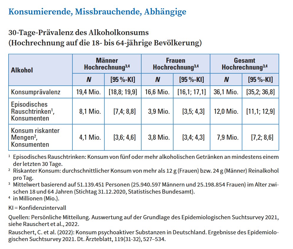 Die ICD-Diagnose „Psychische und Verhaltensstörungen durch Alkohol (F 10) lag bei den Männern auf dem dritten Platz der Hauptdiagnosen für 2023. Eine erweiterte Folge der Bandbreiten von Suizid bis Mord, von Lügeninszenierungen, raffiniertesten Verdeckungen und allen klassischen Suchtsymptomen sind Leiden, die Partner, Familien und alle Umfelder zu tragen haben. Öffentlich beschäftigt sich damit das Kölner Bundesinstitut für Öffentliche Gesundheit unter im Netz kaum auffindbaren Zugang https://www.oeffentlichergesundheitsdienst.de/ und zuletzt das DHS Jahrbuch Sucht 2025 mit Sitz in Hamm, aus dem als Quelle zitiert wird: (https://www.dhs.de/fileadmin/user_upload/pdf/Jahrbuch_Sucht/JBSucht2025_komplett_WEB.pdf. Zwei beispielhafte Tabellen skizzieren diese spezifische Suchtdramatik:
